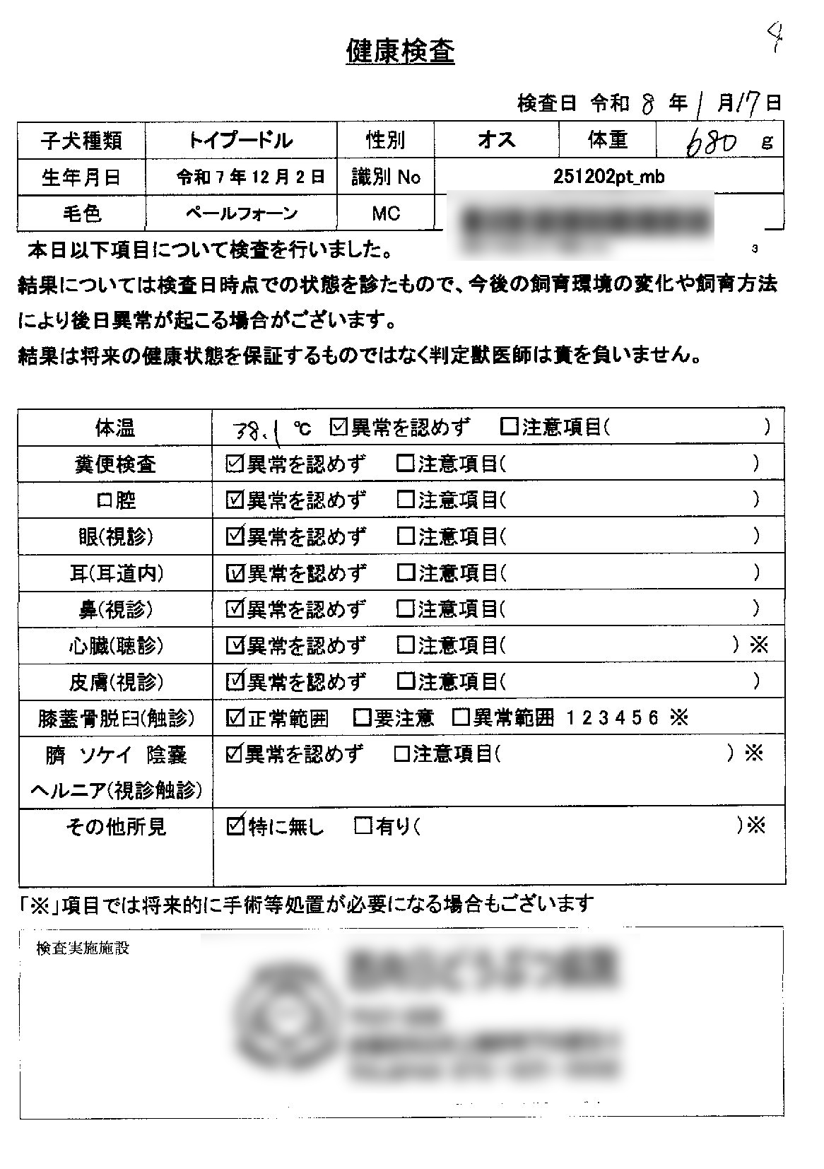 1月17日予防注射と健康診断、マイクロチップ挿入が無事終りました、欠点はございません健康状態良好ですので即日お迎え可能でございます。